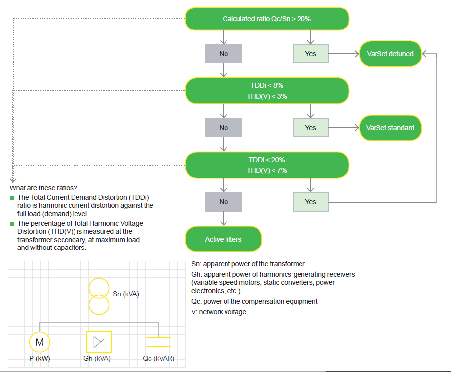 Different types of compensation must be chosen according to the power of the harmonic generators: standard or detuned. They can be selected as shown on the following chart.